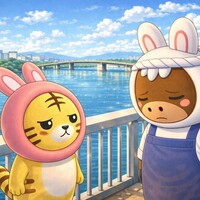 寅うさと馬うさは、 森の 食堂を あとにして、 ゆっくり 歩きました。 ついた ところは―― 湖が よく 見える、 大きな 橋の 上。 きらきら ひかる 水。 そよそよ ふく かぜ。 とても きれいな 場所です。 「ねえねえ、馬うさ君!」 寅うさは、 いつもの 調子で にこにこ。 「さっきの お好み焼き、 すっごく おいしかったね…