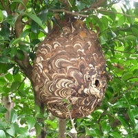 今朝、うちの奥さんが庭のシラカシの木を見て「あれハチの巣と違うかな?」と、熱の出るようなおぞましいセリフを口にしました。(画像は借り物です) 近寄って見ると、高さ2mほどにあるお隣に少しはみ出した小枝にぶら下がった小玉スイカくらいの大きさのハチの巣でした。普通サイズのスズメバチが、その巣の入り口付近を…