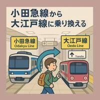 新宿駅で小田急線から都営大江戸線にスムーズに乗り換えるための手順、乗車位置、所要時間などを分かりやすく解説しています。