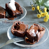 どうも、ぼくです。 本日はバレンタインレシピの第三弾! (いつまで続くんだ?) 食べたかったのは、めっちゃチョコが流れてくるこういうやつ!! 【ラム酒香るフォンダンショコラ】 流れるチョコの夢を叶える為、通常使う薄力粉(しっかり火を通さなきゃダメ)の代わりに、コーンスターチor片栗粉を使用。しかも粉は最小限…