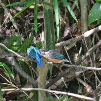 千里の池 6月7日(火) カワセミの雛が2羽(自分時間で・・・)、巣から出てきていました。 色がくすんでいるのが子どもで、青いのが親です。 池に着くと、子どもが口を大きく開けて 食べ物をねだっていました。 親は 何度も餌を運び、子どもにあげています。 子どもの口に餌(魚やエビ)を放り込むと、親は子供から離れ…