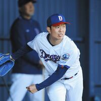 ◇5日 中日春季キャンプ(沖縄・北谷) 読谷組の中日・松葉貴大投手(35)が北谷組の練習に参加し、井上監督が見守る中で約70球を投げ込...
