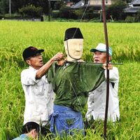 弓引くかかし登場 伊賀・日置神社の神饌田:中日新聞Web