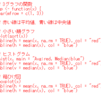 www.crosshyou.info の続きです。 今回は販売台数をグラフにしてみましょう。 まずは、小さい順グラフ、ヒストグラム、箱ひげ図の3つのグラフを一度に作成する関数を作ります。 gpという名前の関数を作りました。 それでは販売台数をグラフにしてみます。 青い線が中央値、赤い線が平均値なので、平均値のほうが大きいこ…
