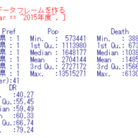 www.crosshyou.info の続きです。 前回は2006年度よりも2014年度のほうが死亡者が多かったことがわかりました。 今回は2015年度のデータで、総人口1万人当りの死亡者数と人口密度、県内総生産の関係を見てみます。 まずは、2015年度だけのデータフレームを作成します。d15という名前のデータフレームにしました。 Yearは必…