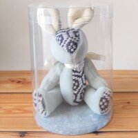 昔話に出てきそうな和風のスタンダードなウサギ。 ほんのりブルーのボディに、こぎん刺しはグレーで。 秋の夜のような、静かな雪降る冬のような静けさをイメージしました。 秋冬にも似合うウサギです。 こぎん模様は「亀甲」。言わずと知れた長寿を表す伝統模様。 ウサギは飛躍の縁起物なので…