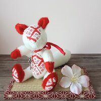 赤と白が華やか。稲荷の狐を意識した白狐です。 首の飾りに鉤のチャーム。稲荷の狐がくわえる玉や鉤のモチーフから決めました。 対になる黒狐もいます。 https://www.iichi.com/listing/item/2721755 しっぽはダブルジョイントで取り付けてあります…