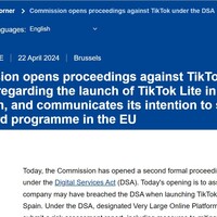 EUの欧州委員会は、中国ByteDance資本のTikTokをDSA(デジタルサービス法)違反の疑いで2回目の調査を開始したと発表した。新機能の中毒性を懸念しており、この機能の停止措置の可能性もある。