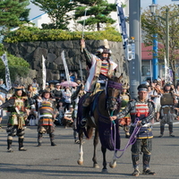 ゲストなしの謙信公祭出陣行列 村山市長が馬上で勝どき