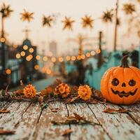 夕暮れのテラスに並ぶハロウィンカボチャの写真はハロウィンに関連する施設・観光のフリー素材です。高解像度(5824px×3264px)の素材を無料でダウンロードできます。