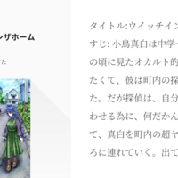 タイトル:ウイッチインザホーム あらすじ: 小鳥真白は中学一年生。 子どもの頃に見たオカルト的体験を証明したくて、彼は町内の探偵に相談した。 だが探偵は、自分の仕事を手伝わせる為に、 何だかんだ言いくるめて、真白を町内の超ヤバイ人のところに連れていく。 出てきたのは思ってたより普