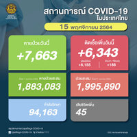 タイ保健省は2021年11月15日(月)朝、1日で確認された新型コロナウイルス陽性者が6,343人で、45人が