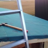 いや~~~~~! 屋根まで出来んかった~~~(><) お昼からは、まず屋根の鼻隠し部分に水切りを付けまして。防水シートを貼ります。クルクル巻になった防水シートをタッカー(ホッチキスのゴツイ奴)でとめてきます。屋根の大きさがこの程度なので片側2列ちょっきり。1枚目と2枚目のカブリは10Cmでテッペンは反対…