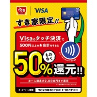 すき家は、Visaのタッチ決済で500円以上の決済を行なうと、もれなく50%キャッシュバックを受けられるキャンペーンを10月1日から10月31日まで実施する。期間中の還元上限は2,000円まで。特典の付与時期は12月中旬以降。