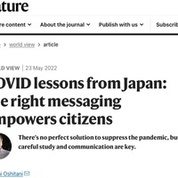Nature「COVIDが日本に残した教訓:正しいメッセージングが市民に力を与える. パンデミック抑制のための完璧な解決策はないが,慎重な調査とコミュニケーションが鍵になる」押谷仁 ---私たちは今,元通りの状態に戻っているわけではありません.各国は,感染の抑制と社会・経済活動の維持の最適なバランスを追求し続けなければなりません.どのように?文化,伝統,法的枠組み,既存の慣行に応じた手持ちのあらゆる手段を駆使するのです.世界中の苦しみを最小限に抑えるために.