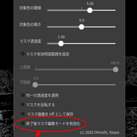 9月のはじめにアップデートしたばかりのこのツールですが、またアップデートします。今回の機能追加は、終了後、マスク編集モードを有効にするかどうかというオプションをつけました。これをチェックしないと、マスク編集モードをオフにして終了します。マスクをつけた後引き続きマスクの編集作業に入りたい場合は、[終了…