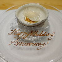 ▼ 前回 ディナーの時間。 オーナーソムリエさんと懐かしの再会を経て着席。 この日はわたしたちを入れて5、6組かな? 厨房を取り囲むような円形のカウンター席に皆 座ってのお食事一斉スタートです。 ウェルカムドリンク的な?黒龍のお酒がサービスで出されたよ。 からの、お酒オーダー。 わたしの ロドリゴさんの 日本…